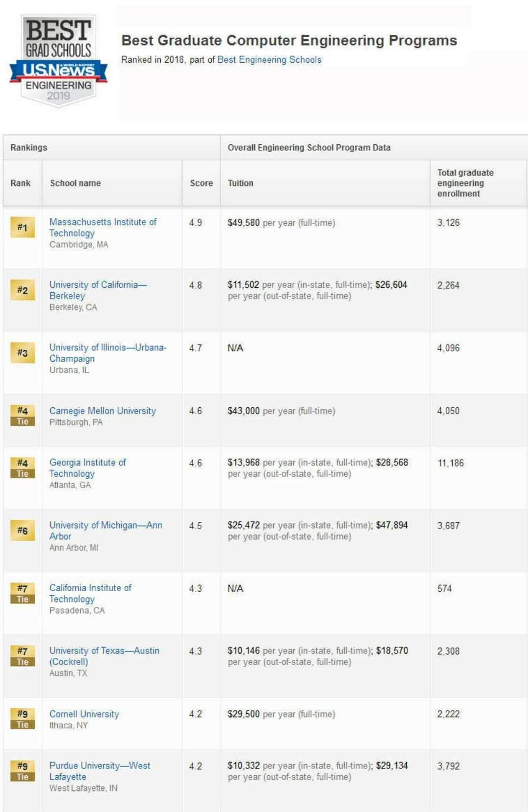 2019年USnews研究生工程学院计算机工程专业排名前十学校