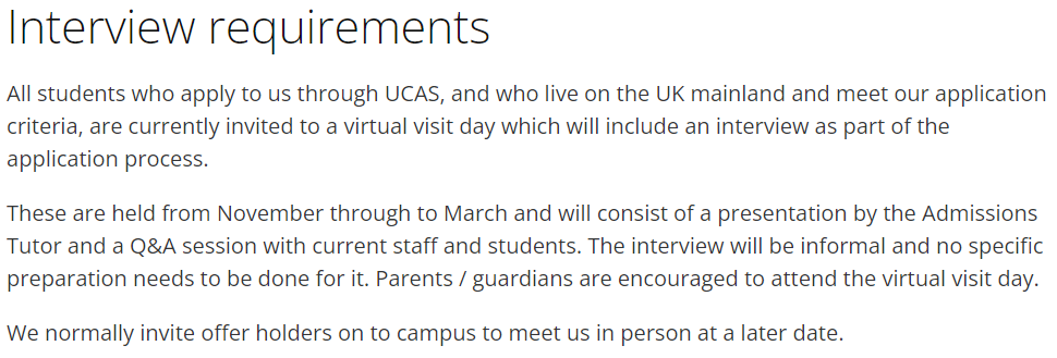 申请者可以 在线 或 亲自参加面试 。在个人陈述中提供的信息可能会被用作与学术人员面试时进一步讨论的基础。