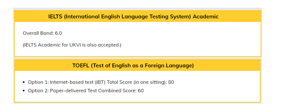 高考外语语种为英语:申请人的高考外语语种必须为英语。高考外语语种并非英语的申请人,必须具备有效而达标的英语考试成绩 ( 如雅思、托福等 ) 。