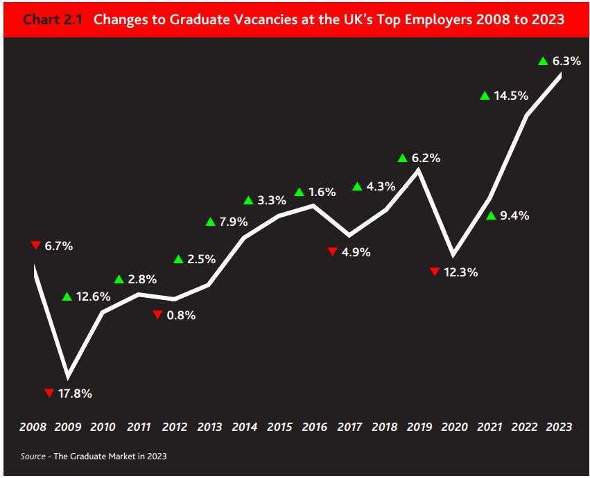 与2021年相比,2022年招聘人数增长了14.5%,这是英国有史以来毕业生空缺岗位最大年度增幅,使毕业生招聘达到了迄今为止的最高水平。