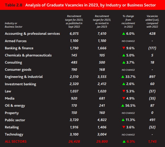 2023年15个最受欢迎的行业中,有11个行业招聘毕业生人数同比增加,特别是四大会计事务所,2022年招聘了2,300多名应届毕业生,这是英国有史以来单一雇主招聘最多毕业生的一次。