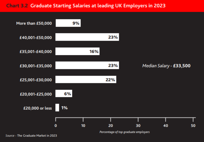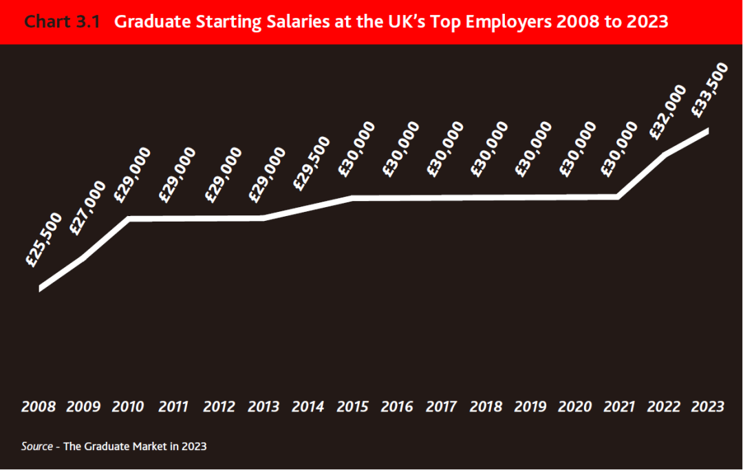 2023年也是英国TOP雇主连续第二年提高毕业生起薪,达到3.35万英镑的新中位数起薪,与2022年起薪相比,增长了1,500英镑,约11.7%。