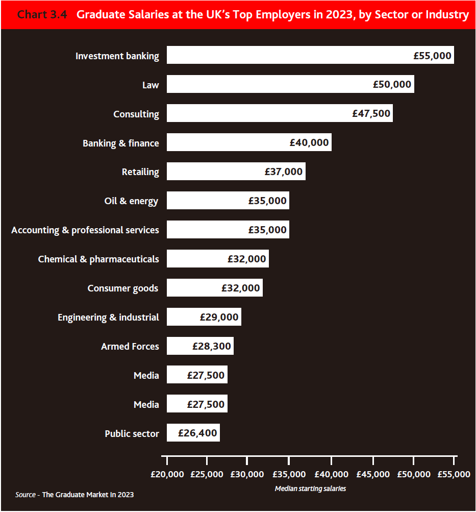 预计2023年毕业生起薪最高的是投资银行领域,起薪中位数为55,000英镑,其次是律所,起薪中位数为50,000英镑,之后是咨询公司,起薪中位数为47,500英镑。