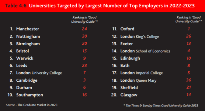 最受招聘应届生的高级雇主关注的10所英国大学分别为: