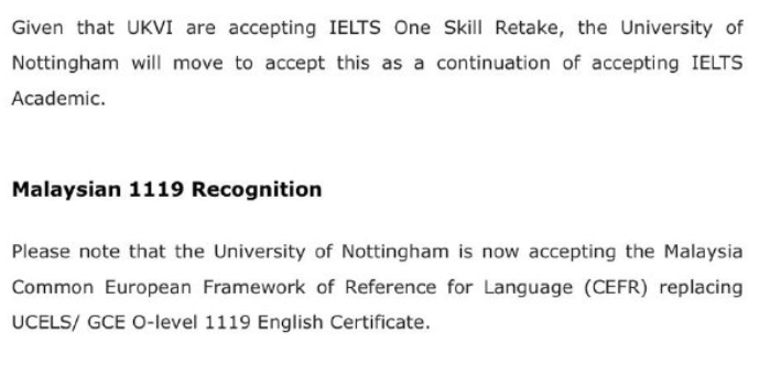 鉴于UKVI正在接受雅思单项技能重考,诺丁汉大学也将继续接受雅思学术考试。
