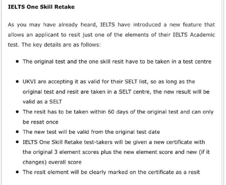 需被UKVI的SELT list上认可有效,所以只要原始测试和单科重考在一个SELT centre,新的考试结果将被认作为有效SELT结果。 单科重考需要在原测试结果60天内完成,并且仅可重考一次