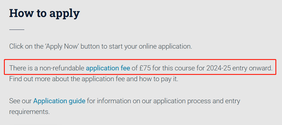 从2023年9月20日开始,克兰菲尔德大学将对2024-25年入学的授课型硕士申请 收取 75英镑的申请费 (研究型硕士暂不收取),官网已经更新。