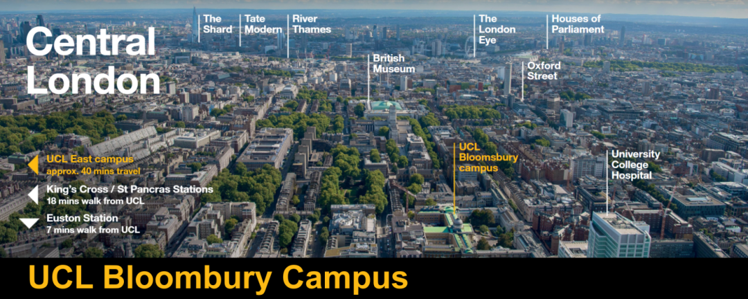 UCL,地处伦敦市中心布鲁姆斯伯里区,邻近大英图书馆和大英博物馆。