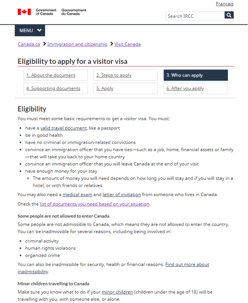 也可能因为安全、健康或经济原因而被拒绝入境。 未成年人去加拿大旅行政策,在加拿大, 18 岁以下的儿童被视为未成年人。他们必须遵循与其他游客相同的规则才能进入加拿大。