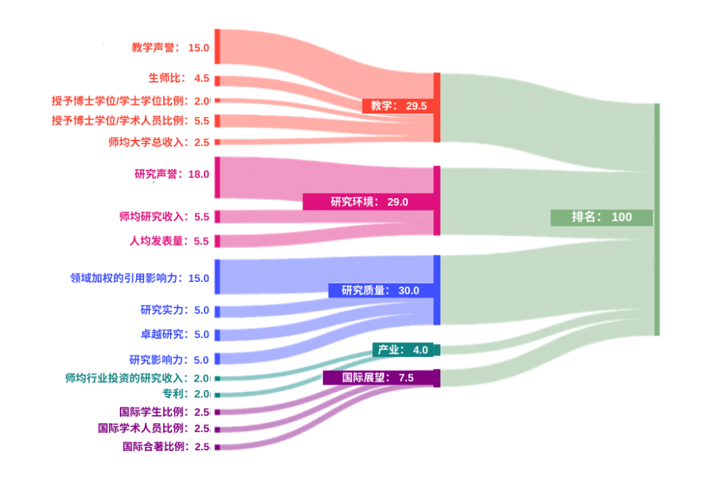 排名的绩效指标仍为5大方面,但命名有所更改,分别为 教学、研究环境、研究质量、国际展望和产业 。