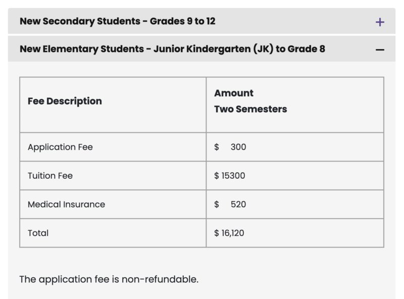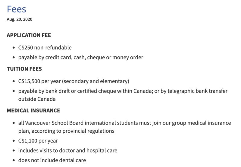 加拿大公民和永久居民,以及持有学签、工签的临时居民的子女就读当地的公立中小学校是免费的。但国际学生就读当地学校则要支付高额的学费。加拿大的各个地方教育局的学费并不一致,便宜的1.2万加币,贵点的1.6万加币。我们分别对比了多伦多、温哥华、卡尔加里、温尼伯几个主要城市的下属学区教育局官网,了解了中国大陆孩子留学加拿大的最多的几个城市的学费相关情况。
