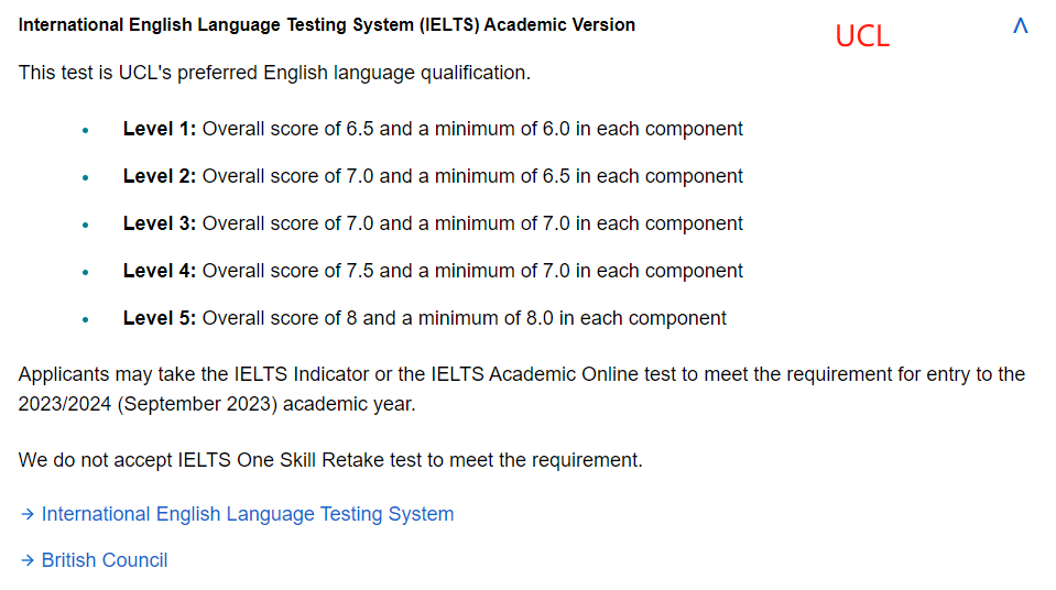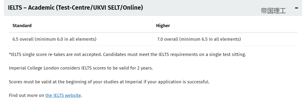 只接受单次雅思考试成绩,要求6.5(小分6.0)-7.0(小分6.5)之间;