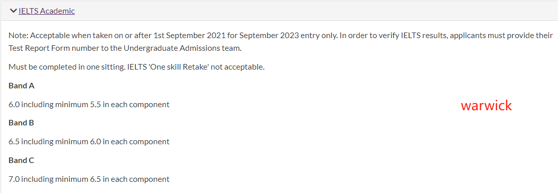 明确表示所有单项成绩必须在一次测试中完成,英语语言要求分为ABCDE,不同专业要求不同(C级只适用于研究生专业),像牙科要求等级为A,艺术与人文学院和社会科学与公共政策学院等要求雅思等级为B。