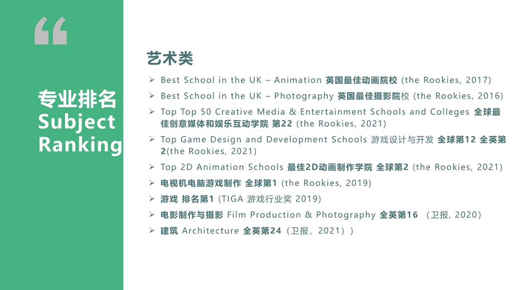 早在2015年,UH就被CG Student Awards评为英国第1、全球第12的动画名校; 在2017和2019年的Rookies Awards动画院校排名中,UH还曾位列过世界第一的位置。
