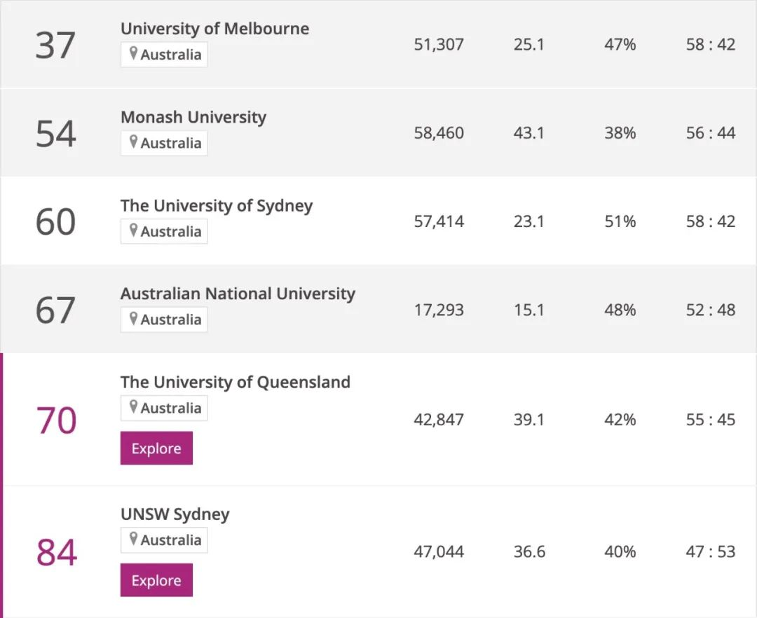 墨大是再以世界第37名的好成绩,摘下澳洲NO.1,继续着在澳四大排名的“全满贯”之路! 莫纳什大学也以54名的好成绩,再度摘下全澳第二! 悉尼大学世界第60、澳国立大学世界第67、昆士兰大学世界第70、新南威尔士大学世界第84也都进入前百!