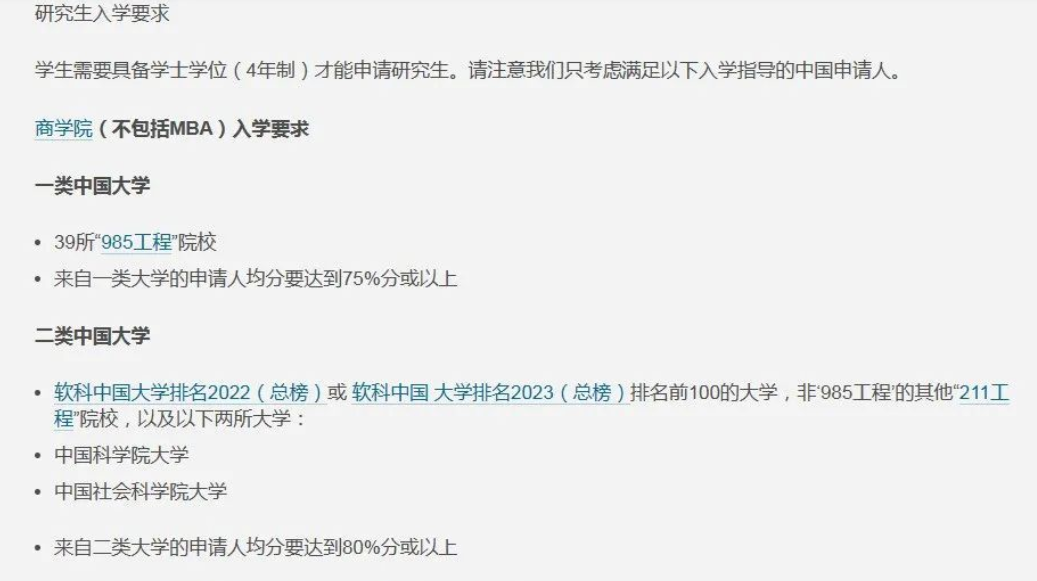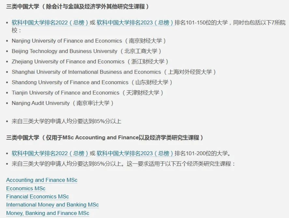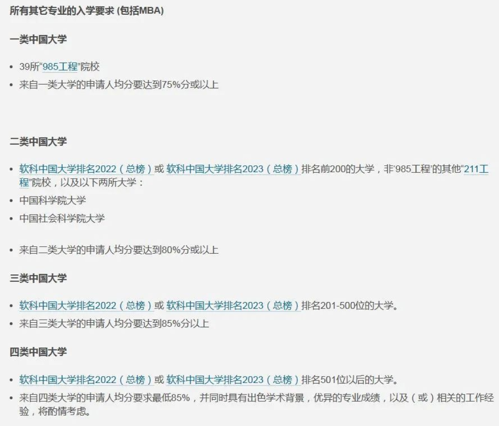 伯明翰大学已开放24年硕士申请,今年伯明翰大学对中国大陆学生的list清单进行了调整,主要变化有 ①新增group 1 ,即39所985大学,对group1院校的成绩要求从去年的80%降低到75%。② 商学院和计算机学院不再合用一个list,进行了更细致的调整。③ 给会计金融硕士和经济学相关专业设置单独的的录取要求。