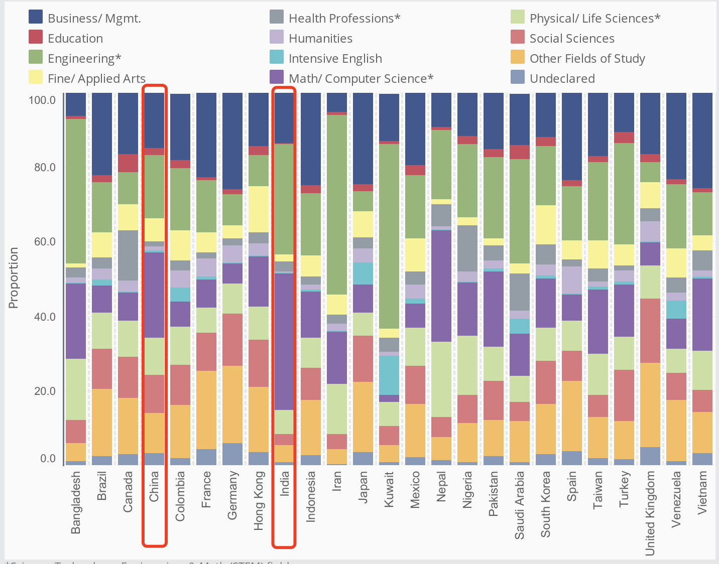 上图是来自Open Doors按大学专业统计的2021/22学年各国国际学生注册人数比例。 在中国留美学生中,最受欢迎的专业类别前三名分别是:
