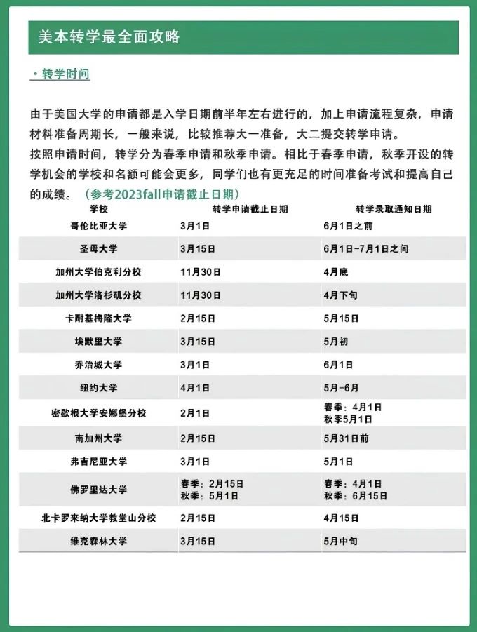 按照申请时间可以把转学申请分为: 春季申请和秋季申请 。其中春季申请一般在10-11月份,个别学校截止日期为9月左右,也有部分院校持续到12月或次年1月,具体要看学校官网。秋季申请一般在入学当年的2月-4月份,最多的集中在3月,部分院校也会持续到5月或者6月中旬。