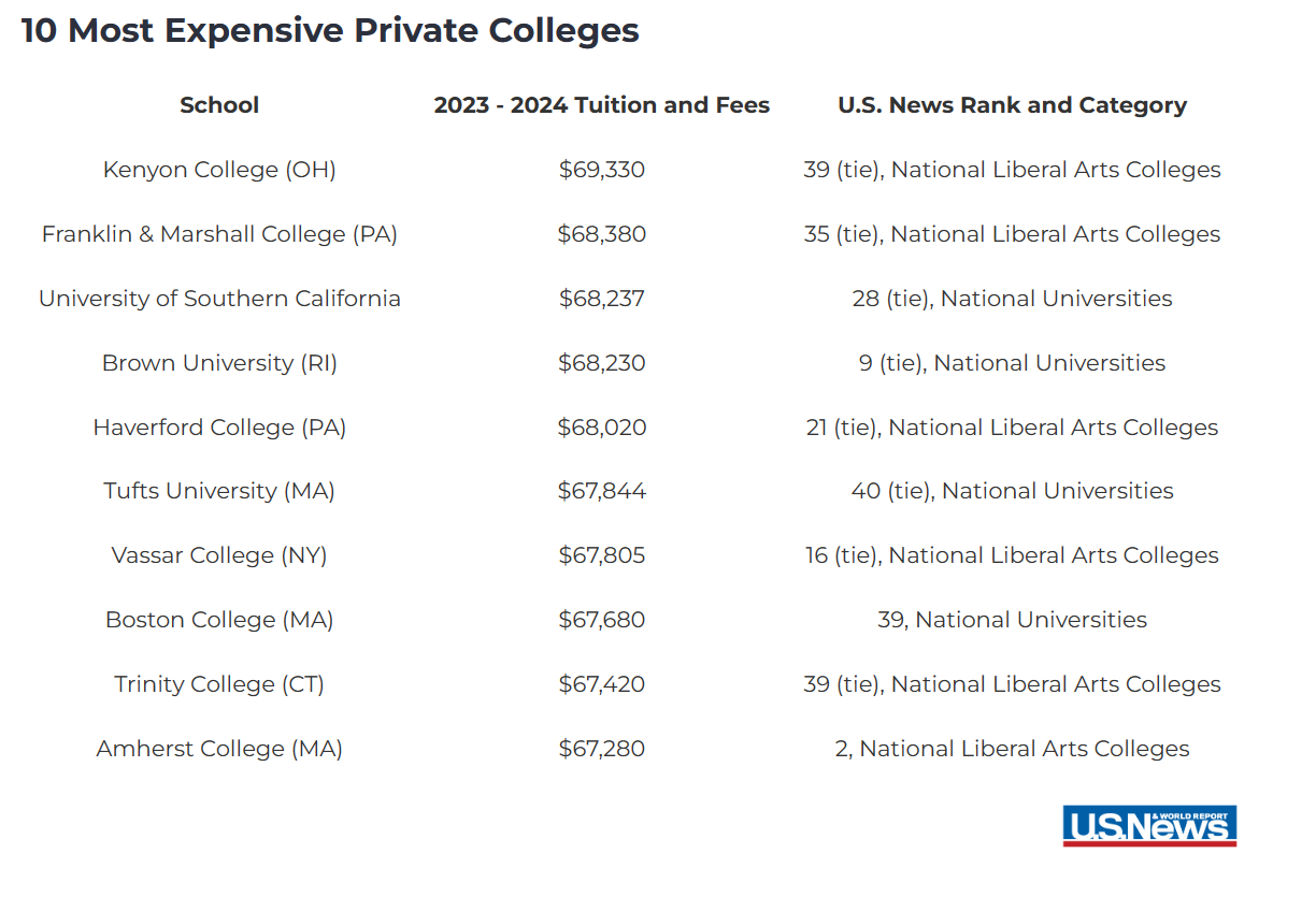 在 10 所学费最昂贵的学校中,有 5 所在各自类别中排名前 30 位。马萨诸塞州的阿默斯特学院(Amherst College)在所有国家文理学院(National Liberal Arts Colleges)中排名第2,是排名最高的学校。该类别中其他排名靠前的名校还有纽约的瓦萨学院(并列第 16 位)和宾夕法尼亚州的哈弗福德学院(并列第 21 位)。罗德岛布朗大学(并列第 9 位)和南加州大学(并列第 28 位)是排名最高的国立大学。