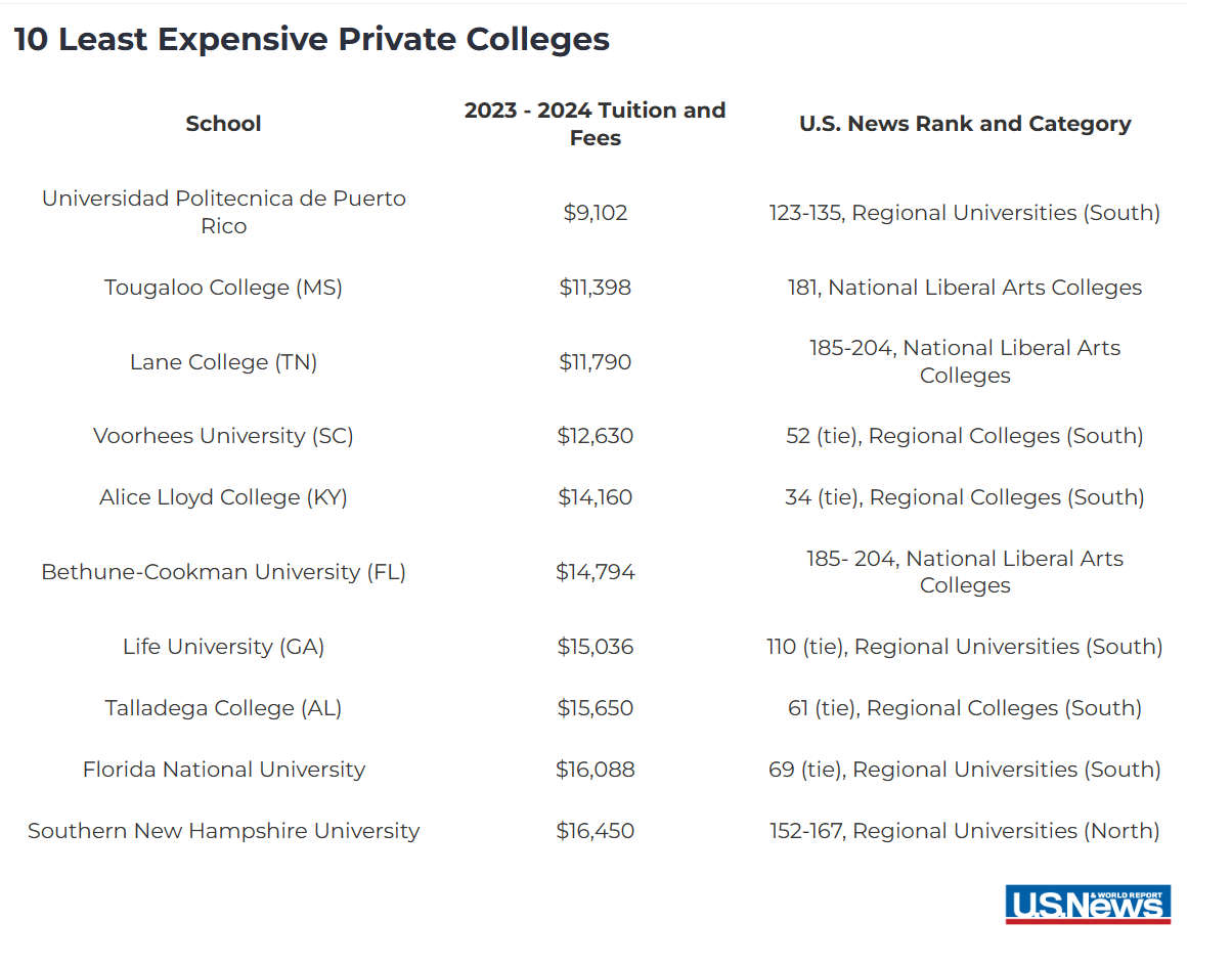 根据U.S. News的数据,10所学费最低的私立大学的平均学费约为13,700美元。