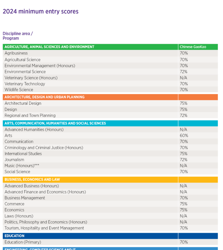 昆士兰大学接受高考成绩申请的专业和入学要求如下: