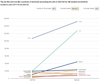 据 HESA 今年更新的数据,在 22 学年,除英国本土学生和欧盟学生外,在所有的留学生中,中国留学生人数最多,共有 151,690 人,其中本科阶段的中国留学生共有 62,935 人,研究生阶段学生共 88,755 人。