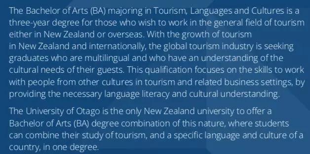 随着新西兰旅游业的不断发展,旅游市场对人才的需求越来越多样化。针对这一需求,奥塔哥大学开设了 “旅游,语言与文化”这一新课程。同时,奥塔哥大学也是全新西兰唯一一所在让学生只修一个 BA 学位,就可以集旅游,语言和文化学习于一体的大学。