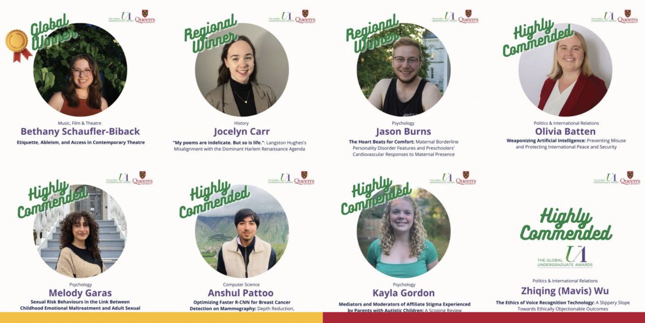 “我谨祝贺Bethany获得最高荣誉。” 艺术与科学院副院长Nick Mosey表示,“这些奖项表彰来自全球的优秀本科生作品,并与全球观众分享这些报告。这些奖项还为我们的八位获奖者提供了良好的基础,让他们可以在女王大学及未来继续与全球同行保持交流。”