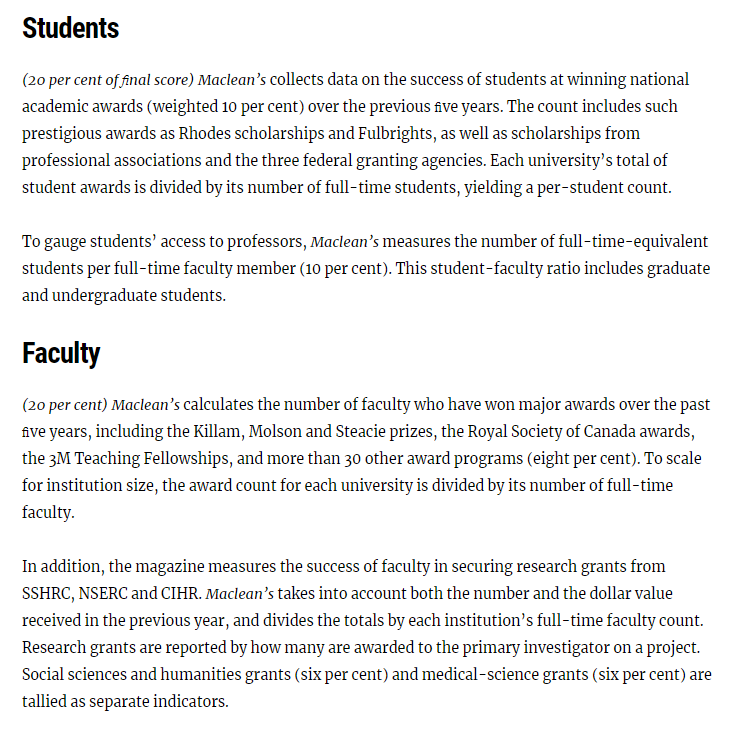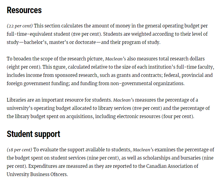 以上数据同样跟往年一样,基于五个大方向对比,占比不同:学生因素20%,院系师资以及科研经费20%,平摊到学生的资金以及图书馆资源22%,学生支持服务18%以及大学声誉20% 。