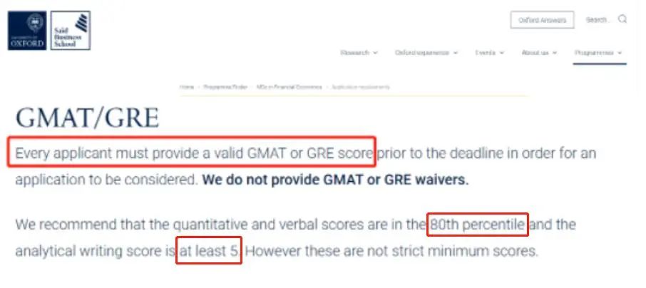 牛津大学在官网中,经济学和商学院专业要求申请者GRE达到80%+,分析性写作5.0分。