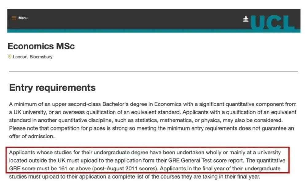 伦敦大学学院经济学硕、比较商业经济学硕士、今年新增的Finance MSc专业等,都要求学生提供GRE成绩,且Quant部分必须为161+。