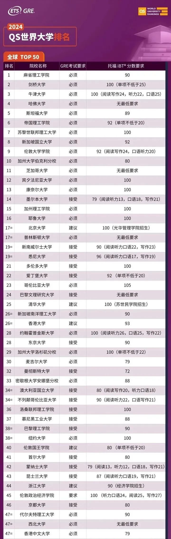 在2024QS世界大学的最新排名中,Top50院校全部强制要求或接受GRE成绩!