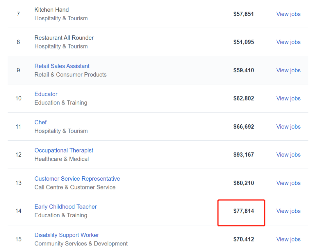 根据澳洲找工作平台SEEK最新数据显示,幼教平均年薪可以高达77814澳币,属于排行前20的高需求领域行业: