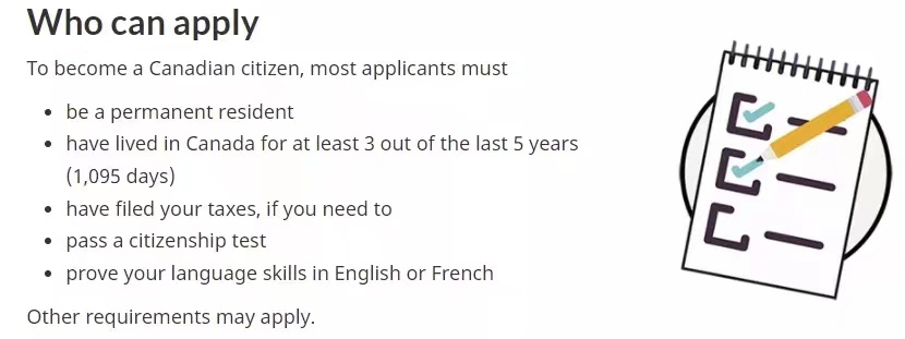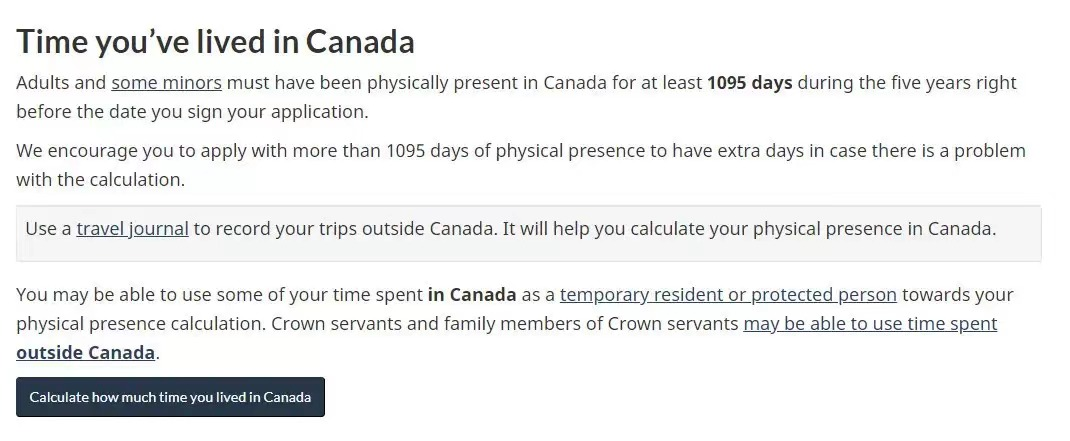 申请人(包括18岁以下独立提交申请入籍的人士,Minor (under age 18) does not have a Canadian parent or a parent who is applying for citizenship at the same time)在提交申请时,在加拿大过去五年内需要居住满1095天。移民局建议申请人在提交申请时,居住超过1095天,以免在计算居住日子时有误差。