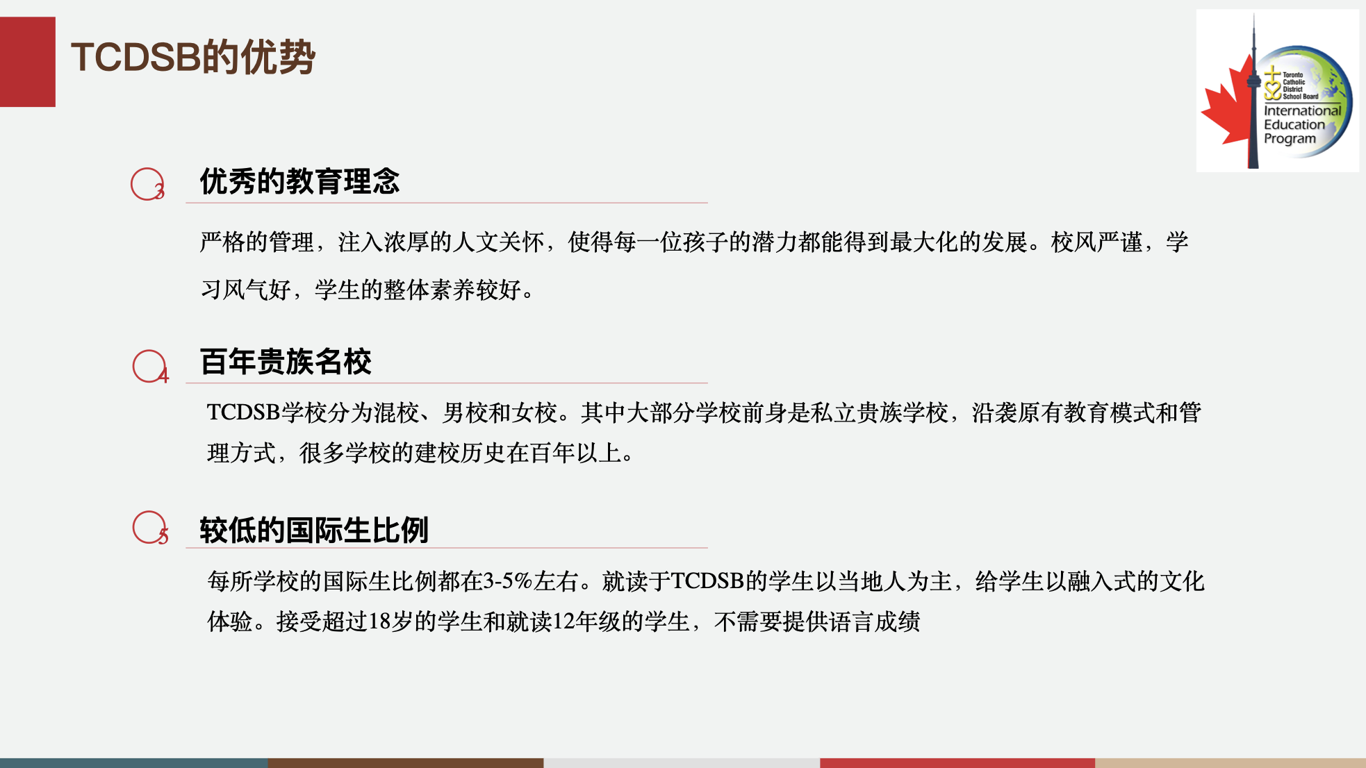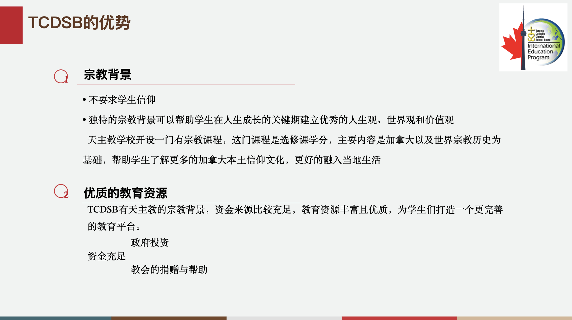 多伦多天主教公立教育局(Toronto Catholic District School Board,简称TCDSB)位于加拿大最大的城市多伦多,下辖学校197所 (165所小学,31所中学、1所成人高中)均可招收国际学生,其中多所学校有超过百年的历史,部分学校前身是私立贵族学校。学校配备现代化的教学、实验设施,学习条件十分优越,开设完整的ESL课程、AP和IB课程等。每所学校的中国国际生比例在3%-5%左右。就读于TCDSB的学生以本地学生为主,这让国际生有了更多融入式的文化体验。