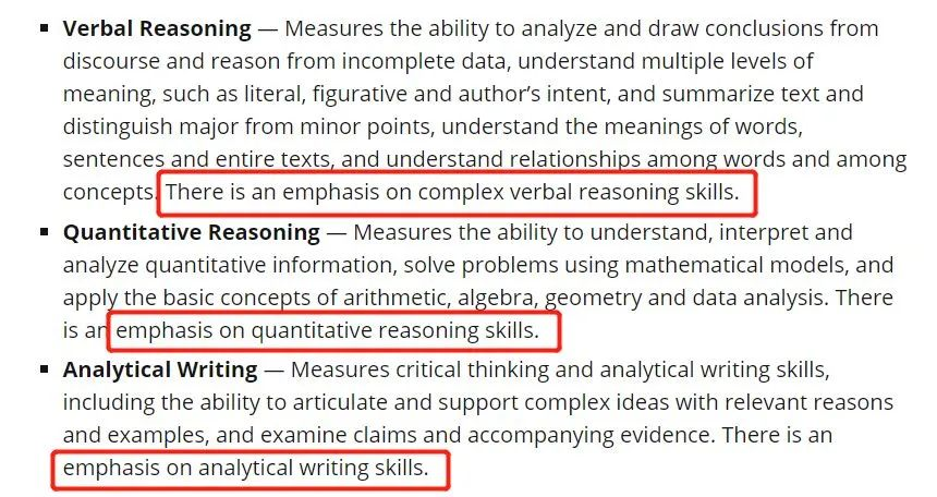 GRE:GRE它考察的内容为Verbal(语文)、Quantitative(数学)、Analytical Writing(写作)。GRE考试没有口语和听力测试,但对词汇量的要求很高。考试重点也集中在英语应用逻辑上,而对口语和听力并不做考察。在GRE官网上,对这个三项考试内容的解释是: