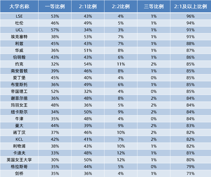 根据HESA的数据,2020学年 有21%的学生获得二等二(2:2)及更低 的学历等级,其中罗素大学的本科学位等级比例见下图 ↓