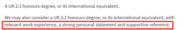 例如 MSc Global Operations and Supply Chain Management 全球运营与供应链管理硕士的录取要求中说“如果学位等级低,但有不少于10个月的带薪工作经验,且工作领域是操作管理或供应链管理;或有相关研究生等级学历”,成绩略低于2:1也可以被考虑。