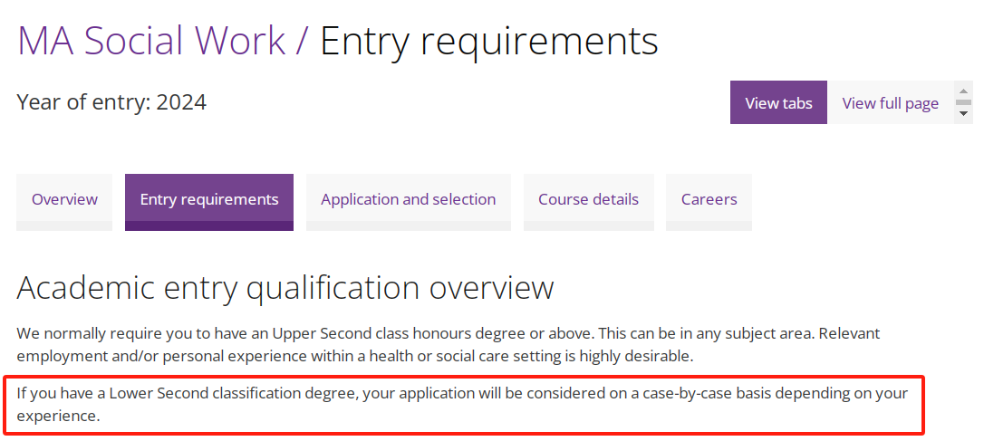 曼大有一些要求英本二等一专业的专业,也不是完全不考虑二等二学生,例 如 MA Social Work 社会工作硕士 ,录取要求中有写: 如果学生是二等二成绩,也会根据经验给予case-by-case考虑。