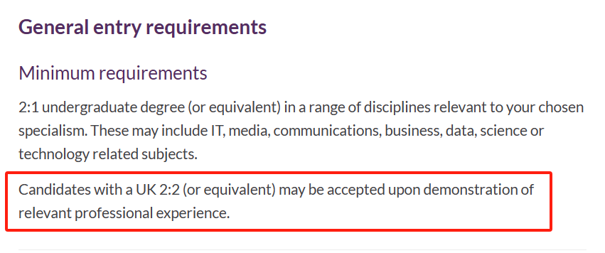 华威多数专业的标准录取要求是2:1,但对于综合背景很有优势、或有工作经验的申请者,也可以考虑2:2成绩,这些专业大部分属于WMG学院,例如以下专业: