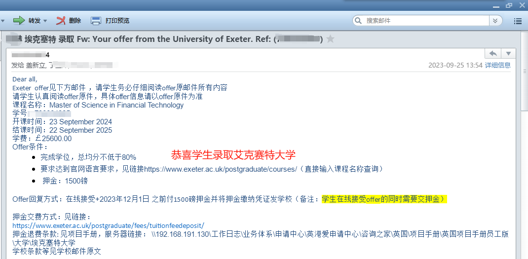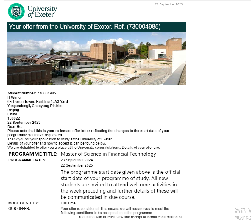 学生本科市场营销专业,内蒙古财经大学,均分89.31;录取艾克赛特大学金融科技专业,申请时无雅思。