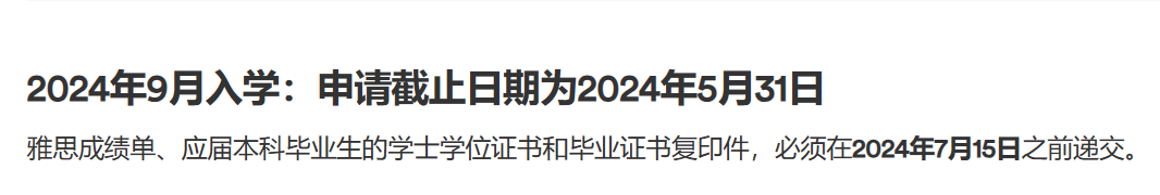 注意:在大学最后一年就读期间就可以递交申请。大学会给适合的学生发放有条件录取通知书,一般情况下要求申请学生在入学当年7月15日之前补交大学期间完整成绩和学位证毕业证。