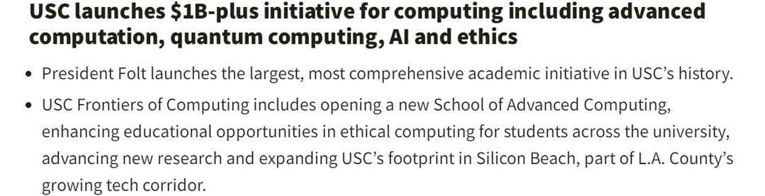 新设高级计算机学院**** 南加州大学5月4日正式宣布,随着大众对CS学习的热度增加以及大学本身对跨学科能力培养的重视,将开设一个高级计算科学学院(School of Advanced Computing)。