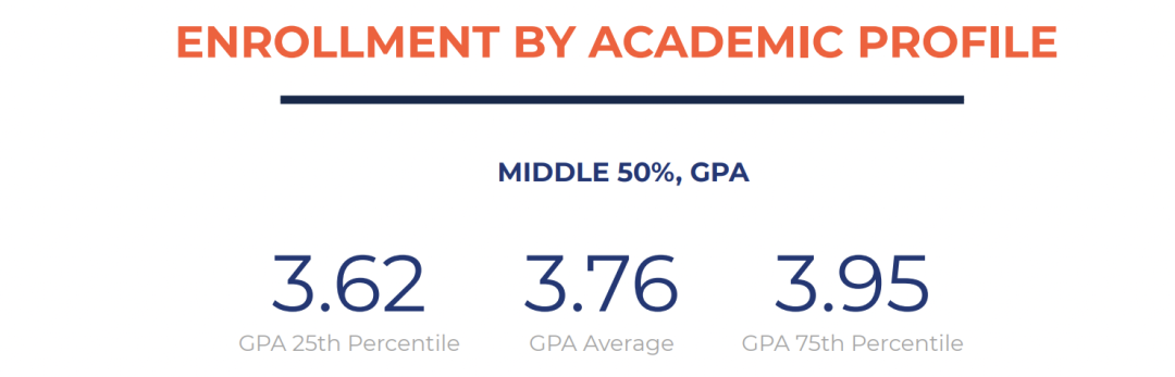 在GPA与标化成绩方面,2023年入学新生的 平均GPA为3.76 ,75% GPA为3.95。