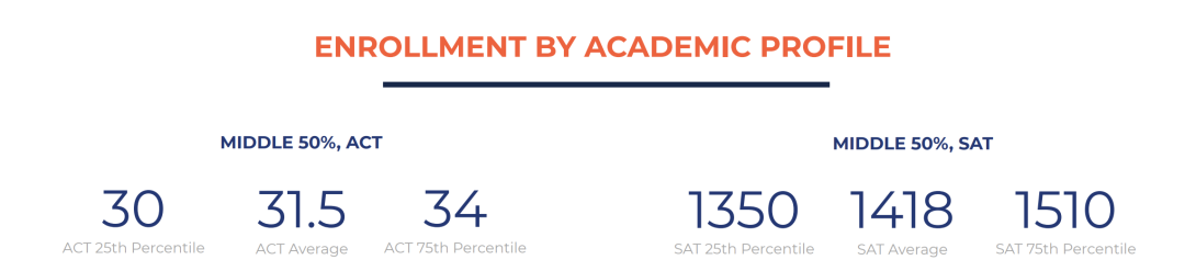 ACT与SAT平均分分别为31.5和1418 。但注意,这只是平均分,如果要在新生中更有优势的话,需要达到ACT 34分与SAT 1510分。
