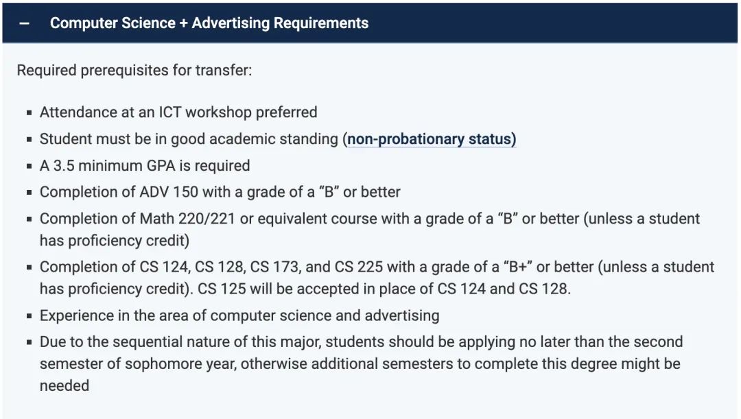 如下图学校官网显示,如果想要转到CS+广告专业,学生需要保持良好的学术表现、取得最低3.5的GPA、以及完成相关广告、数学和CS方面的课程,即可在校内申请转专业。