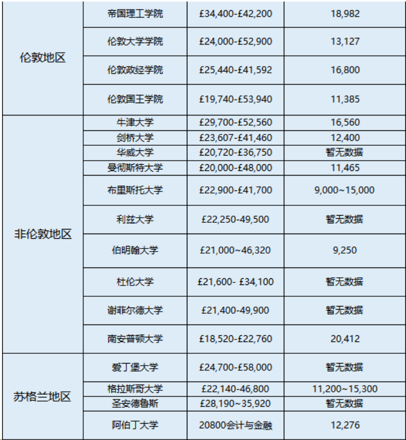 有的学生说30万就够,有的学生说至少要60万。网上搜了一下,这费用差距确实不小,伦敦地区最高能到70万,非伦敦地区最低也要到45万了。