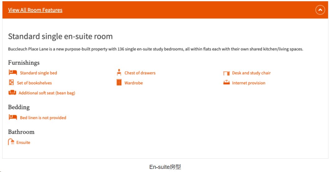 像爱丁堡大学En-suite房型,一年价格在£7,601-9,790英镑左右,带有独立卫生间,厨房可能需要共享。