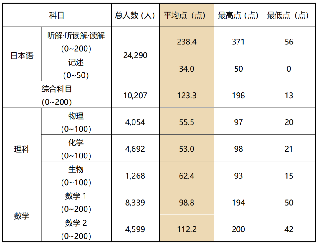 参考下表中2020年11月份EJU考试各门科目的平均成绩,了解一下EJU整体的分数情况。