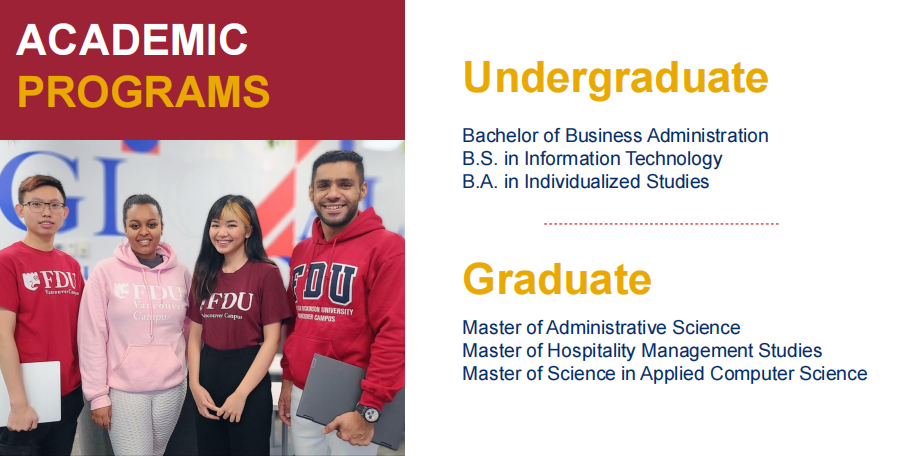 菲尔莱狄更斯大学(Fairleigh Dickinson University,简称FDU)成立于1942年, 是美国新泽西州最大的一所私立综合性大学 。FDU目前共有四个校区,除了位于美国纽约市附近和新泽西北部的校区,在海外还设有加拿大温哥华校区和英国牛津校区。其温哥华校区位于 温哥华市中心 ,目前拥有来自超过80个国家的1200多名学生。 该校区提供3个本科及3个硕士课程,其中应用计算机硕士(Master of Applied Computer Science, MSACS)为符合BC省硕博类省提名申请要求的硕士项目。